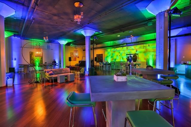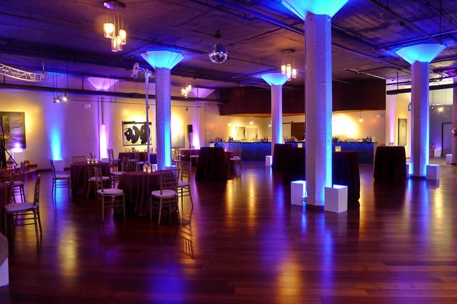 Terra Gallery features lofty ceilings, hardwood floors, and a flexible 5,000+ square-foot space perfect for customizing your event. It includes a reception area with floor-to-ceiling windows. The space also has a state-of-the-art Bose sound system. On the lower level, Mer offers hardwood floors, a stylish bar, large windows, and a built-in oak stage. An adjacent outdoor area can be tented for up to 300 guests. The gallery can accommodate multimedia functions with live feed and real-time conferencing capabilities.